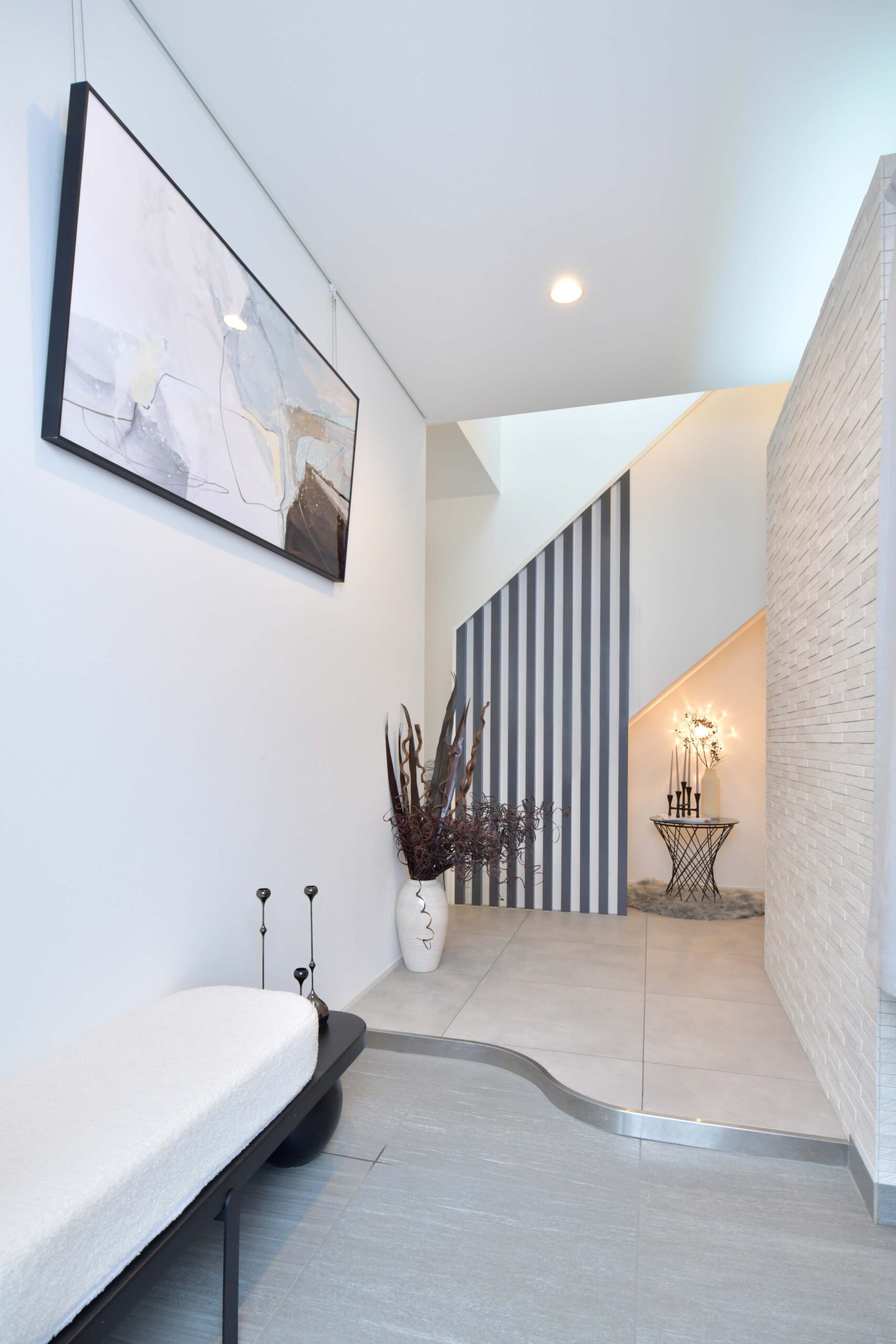R形状の框(かまち)や大判タイルを用いたアプローチが印象的。 お客様を上質に迎える空間デザイン。
