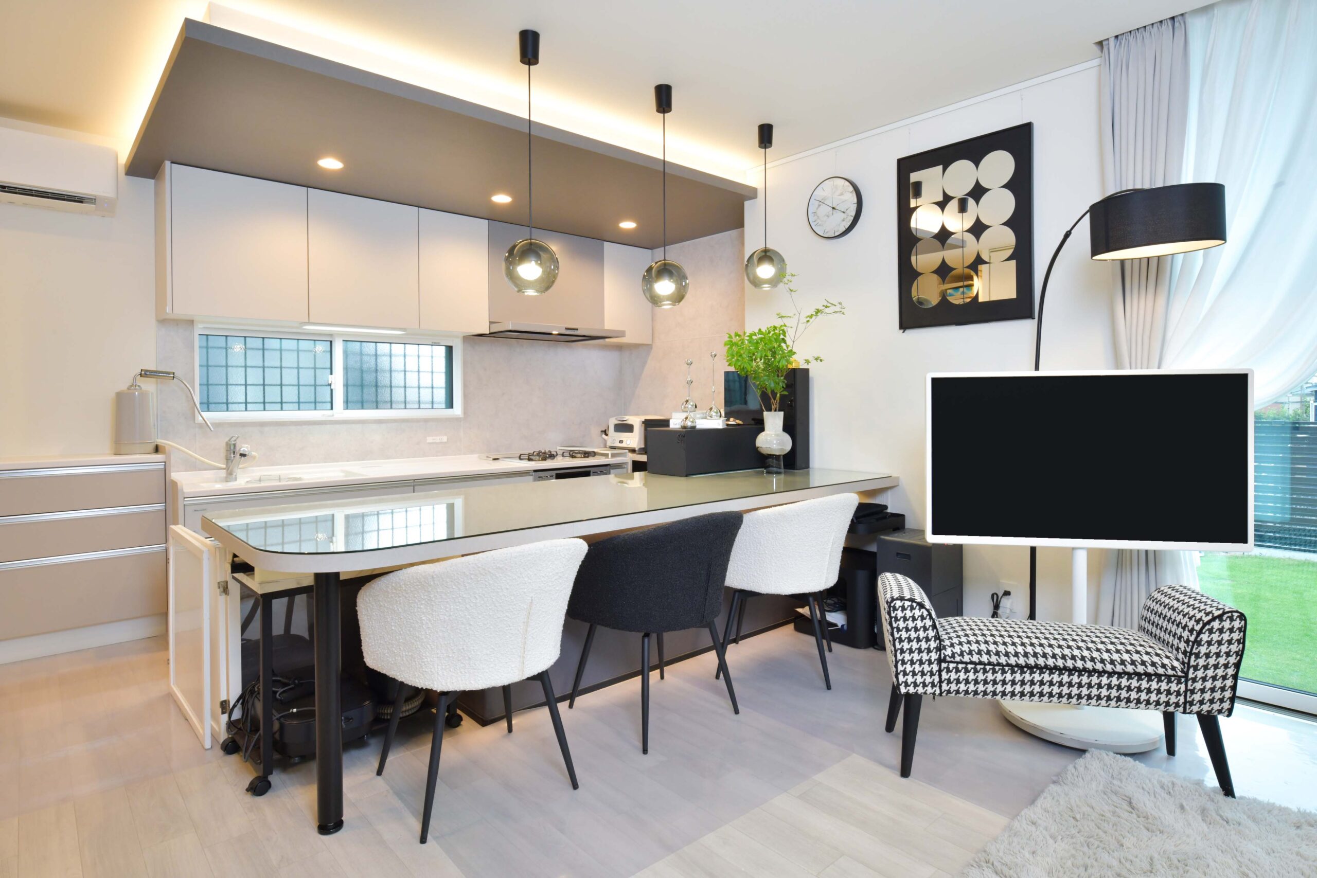 キッチンの床を一段下げ、ダイニングとの目線を合わせた設計。 家族の会話が自然と生まれる団らん空間に。