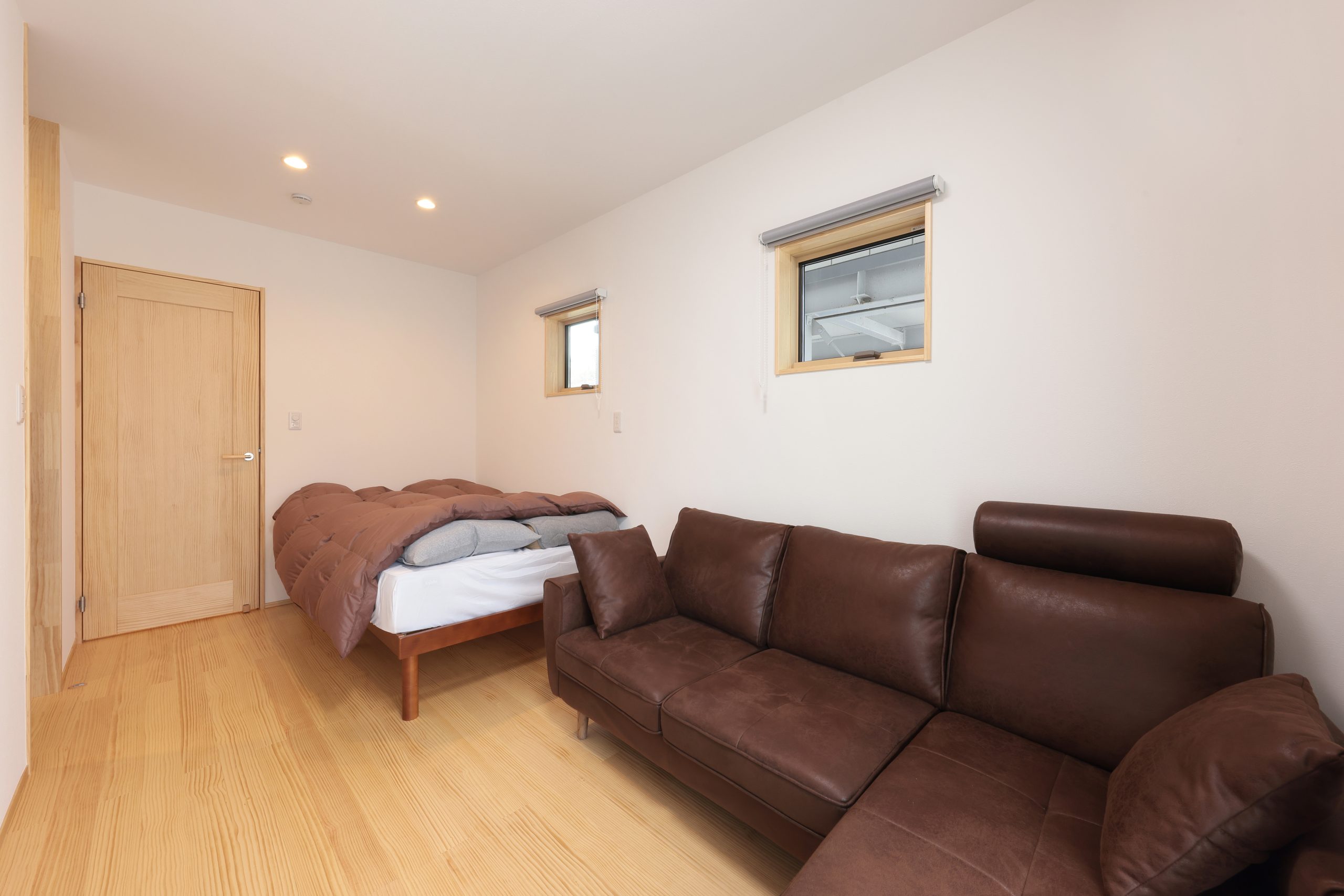この住宅の大きな特徴は、二つの世帯がほどよい距離感を保ちながら生活できるよう、LDKを中心に寝室を両側に配した設計です。