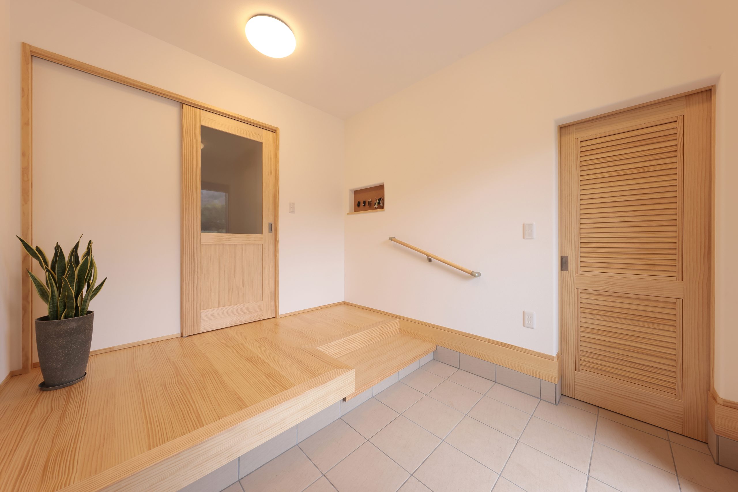 玄関を入ると木の香りと柔らかな光が出迎え、家全体に自然素材のぬくもりが広がる空間が生まれます。