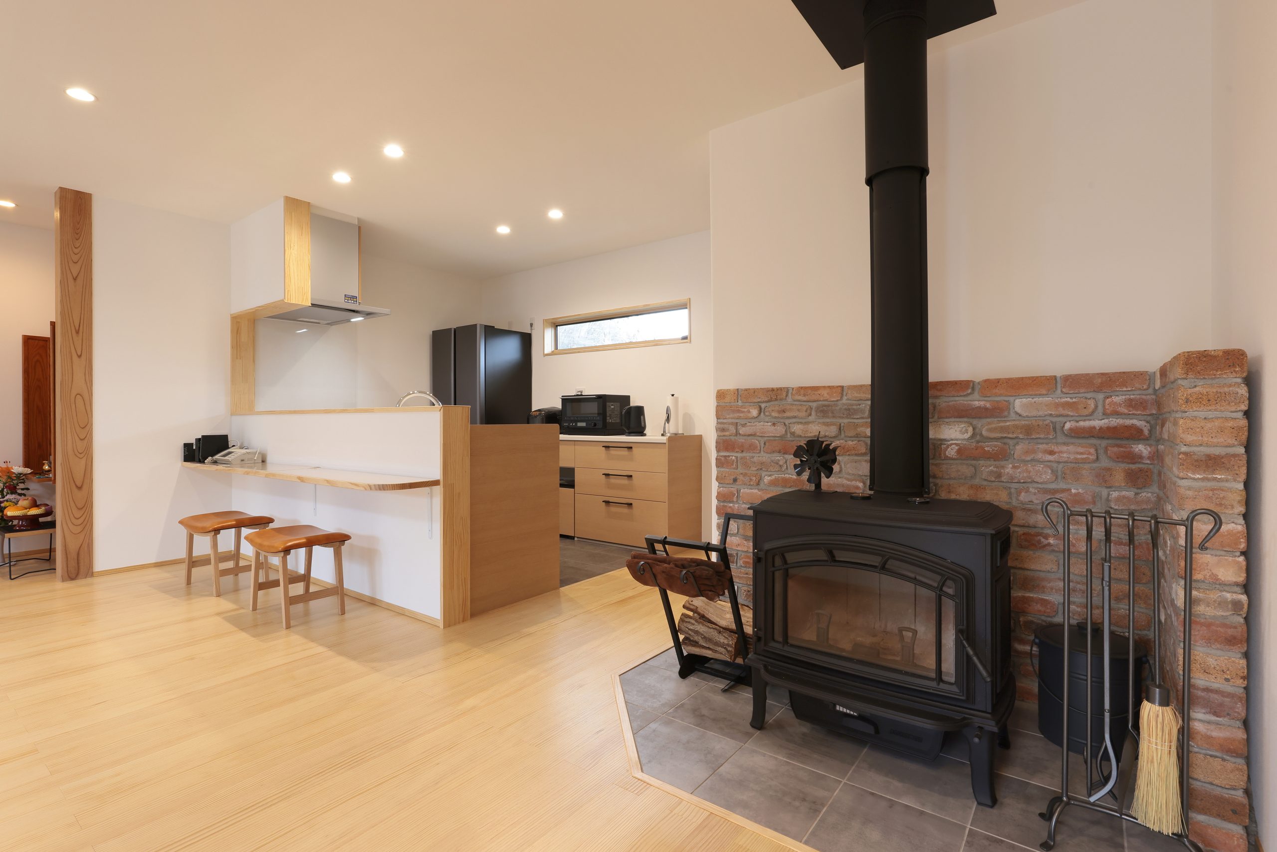 薪ストーブを設置したリビングは、室内全体がやさしい暖かさに包まれ、冬の時間を楽しむ家族の時間が想像できます。