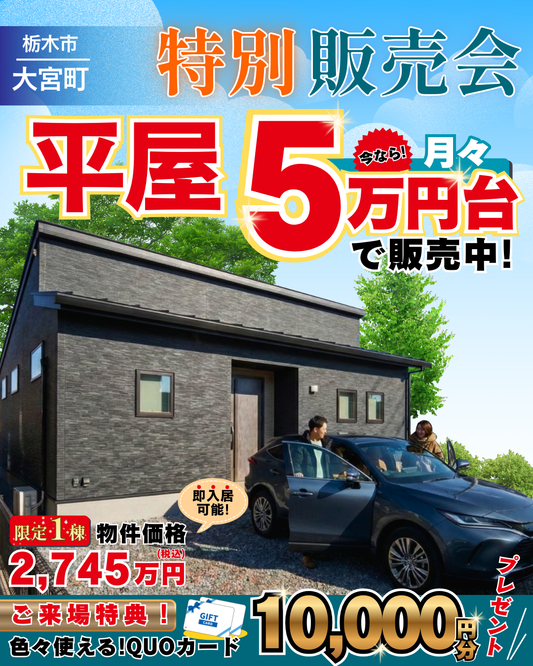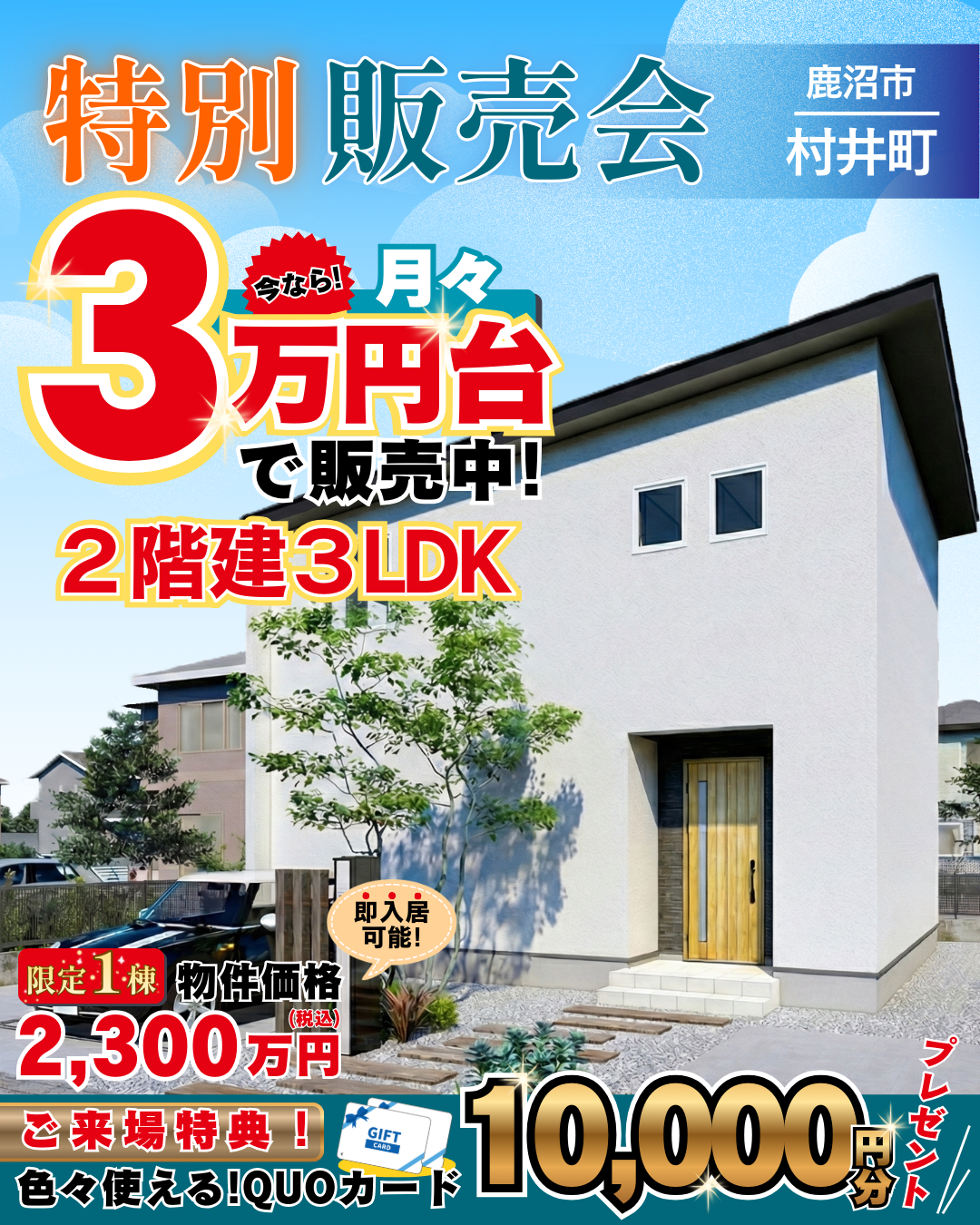 【限定1棟】鹿沼市村井町で、憧れの新築一戸建てを! 家賃並みの支払いで叶う特別販売会!