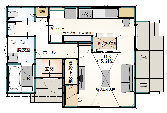 3LDKの間取りに、キッチンまわりの折り下げ天井とリビングの折り上げ天井で空間に立体感と開放感を演出。